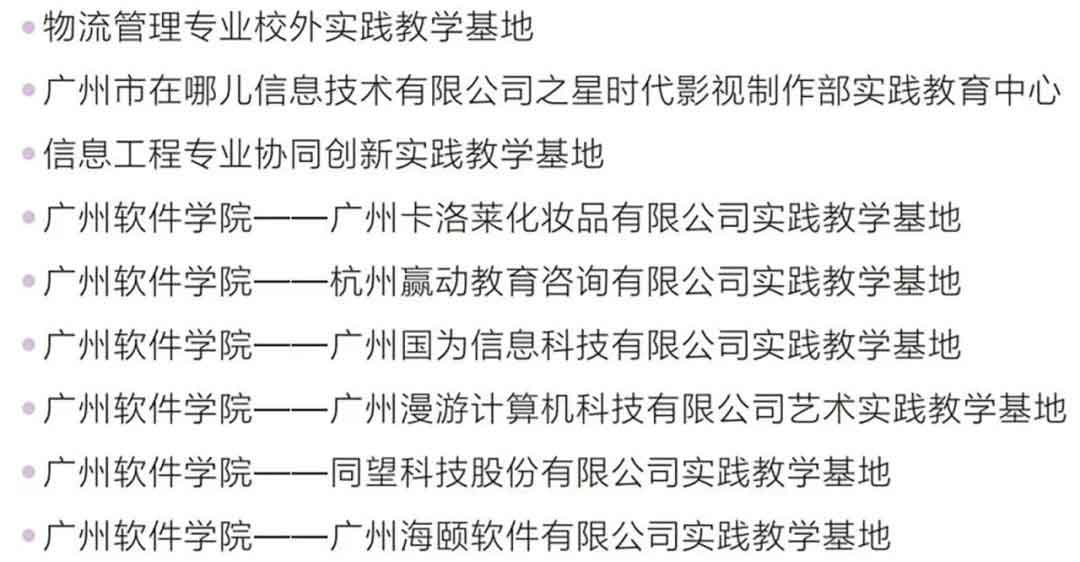 广州软件学院将加强实践教学作为提高应用型人才培养质量的突破口,理工类专业实践教学比重达到50%,文经管类实践教学比重达到30%。拥有2个省级实验教学示范中心和1个省级协同育人平台,建成9个省级大学生实践教学基地。